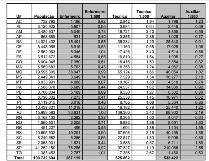 A tabela abaixo mostra a quantidade de profissionais de enfermagem, técnicos, auxiliares, por habitantes nos estados brasileiros.